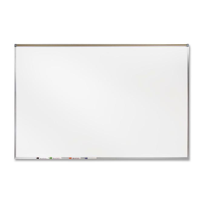 Projection whiteboard features a special white, textured surface that reduces projection glare by 70 percent compared to standard marker boards. Ideal for presentations, slideshows and educational purposes. Magnetic surface functions as a projection board, dry-erase board and durable surface for displaying visual aids. Each board includes an aluminum frame, 1" natural cork map rail, four color markers and an eraser.