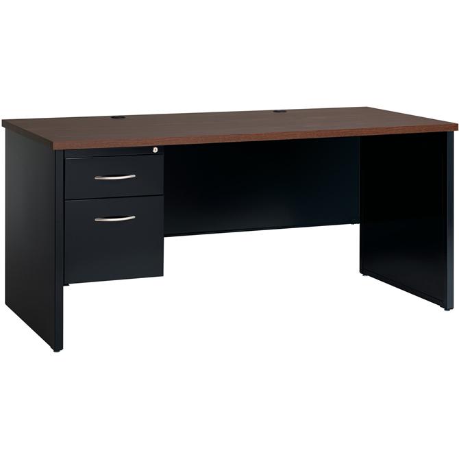 Left-pedestal desk is part of the Lorell Commercial Steel Desk Series with commercial-quality performance and components. Durable steel chassis supports a 1-1/8" thick, laminated top. Laminate is stain-resistant and scratch-resistant for durability. This 66" wide, left-pedestal desk with adjustable leveling glides can be used freestanding or paired with a right return to create an L-workstation. To create a U-workstation, simply combine it with a bridge and right credenza. Desk includes one box drawer for supplies and one file drawer for hanging file folders. Both lock. Steel ball-bearing suspension makes drawers easy to operate quietly. Built-in cord management with two grommets in the top and two more grommets on the end panels provides easy access to power and data while minimizing clutter. Rich walnut laminate and black paint create an upscale look and feel for any application. Superior steel construction withstands heavy activity and relocation.