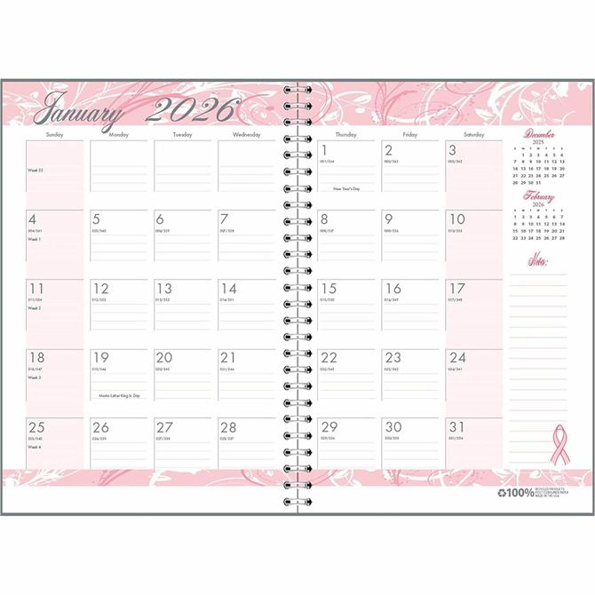 Monthly wire-bound journal offers a great way to raise breast cancer awareness. A portion of the proceeds from this product is donated to fund breast cancer research. Pink hardcover features the iconic pink ribbons and inspirational words, such as Hope, Courage, Faith, Strength, Love and more. Inside, the monthly journal offers a pink ribbon, pink borders on each page, pink shadings on the weekends and pink print to highlight reference months. Dated planning pages range 12 months from January to December. One-page-per-month format includes ruled daily blocks (1-3/8" x 1-3/4"), Sunday-through-Saturday scheduling, ruled notes area, count of days/days remaining, holidays, and past and future months reference. Weeks are numbered to fit the need of every office application. Nonrefillable monthly journal also contains 100 ruled journal pages that are protected by a laminated hardcover with a double-sided storage pocket.
