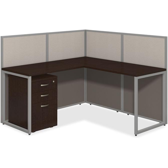 The 60" wide L-Shaped Open Cubicle Desk with 3-Drawer Mobile File Cabinet and 45" high panels delivers a quick, open office solution. The Easy Office 60" wide x 24" deep Straight Office Desk, 36" wide x 24" deep Desk Return, 16" wide pedestal and set of two 60" wide x 45" high Cubicle Panels with corner connectors are part of a stylish, open-office collection that is designed for fast assembly with pre-installed connectors, minimal parts and sturdy design so you can get to work. L-Desk provides a versatile, right-handed or left-handed position with a return to expand your work area. Thermally fused, laminate worksurfaces feature superior resistance to scratches and stains while providing a wire-management grommet to keep cords organized. Easy Office desk attaches to sturdy, 45" high wall panels. Fabric-upholstered panels come in a durable, Light Gray and Storm Gray, two-toned fabric. Commercial construction meets ANSI/BIFMA standards for safety and performance.
