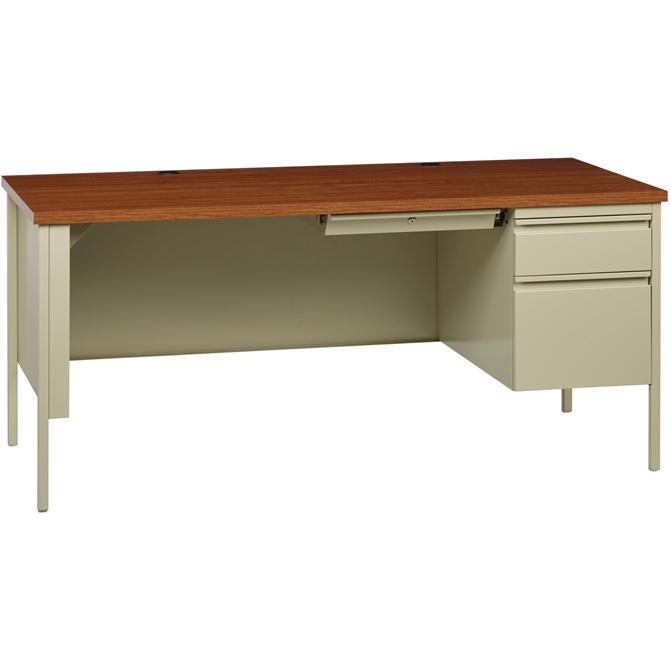 66" wide single-pedestal desk is part of the Lorell Fortress Series, a practical and professional desk solution ideal for business, government and educational offices. Use this right-pedestal desk with a Fortress left return for L-shaped configurations. Both have 3/4-height modesty panels for seamless lines. Durable, high-performance steel construction stands up to rigorous daily use. The 1-1/8" thick top with square edges features an Oak laminate surface that is scratch-resistant, stain-resistant and water-resistant. Desk design also features a box/file pedestal on the right. Both drawers lock and offer full-extension, ball-bearing slides and full-width, integrated drawer pulls. File drawer accommodates letter-size files. Central-locking center drawer features a core-removable lock. Two grommets allow easy cord management. Reinforced, double-frame inner structure keeps desk solid and sturdy for years of use. Steel desk in a putty color meets or exceeds ANSI/BIFMA standards.