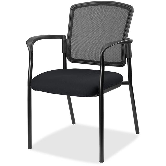 Inviting guest chair features a breathable mesh back and cushioned seat upholstered for comfortable seating in your waiting room or office. Chair is stackable up to four high for convenient, short-term or long-term storage. Black steel frame is powder-coated for durability. Weight capacity is 275 lb. The 3.5" thick seat measures 18.1" wide x 18.9" deep x 18.9" high. Back size 17.9" wide x 2" thick x 16.9" high. Chair is Greenguard compliant.