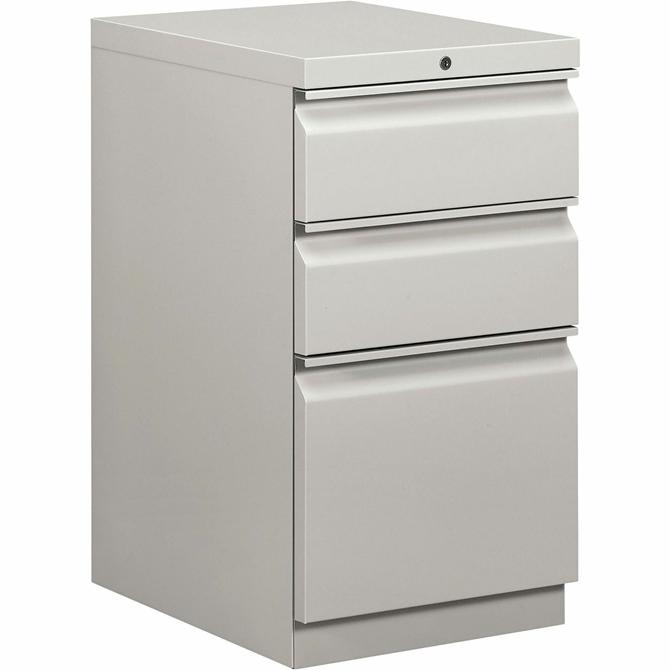 Mobile pedestal with HON Brigade Series 800 lateral-pull design fits under standard HON Initiate, 38000 Series and 29-1/2" worksurfaces. Freestanding pedestal offers one file drawer and two box drawers. High-sided file drawer features two crossrails and accommodates front-to-back filing for letter-size, hanging file folders. Each box drawer has one adjustable divider and a pencil tray. Light gray pedestal also offers a 19-7/8" depth, ball-bearing suspension on the file drawer (90 percent extension), and roller suspension on two box drawers (75 percent extension). Counterweight inhibits tipping when opening more than one drawer. Pedestal is also equipped with HON One Key interchangeable, core-removable lock; fixed front casters; and swivel rear casters. Pedestal meets or exceeds ANSI/BIFMA and ISTA performance standards.