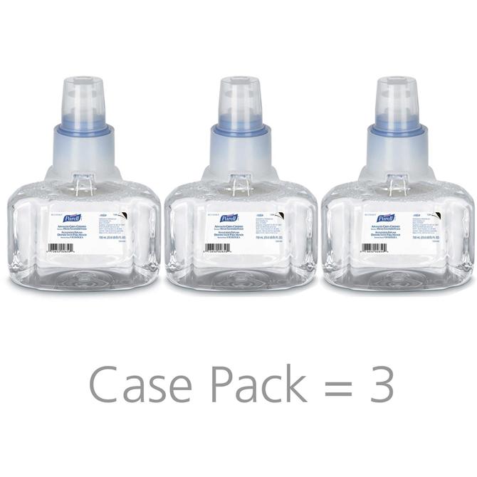 Hand sanitizer foam contains ingredients made from natural renewable resources and kills more than 99.99 percent of most common germs. The 700 ml. refill for PURELL LTX-7 Hands-free Soap Dispenser delights users while supporting a healthy environment. Scientifically advanced, patent-pending formulation meets EcoLogo hand sanitizer standard for environmental leadership and proven performance. Hand sanitizer foam includes a nourishing blend of four skin conditioners and is clinically proven to help maintain skin health. Sanitary-sealed refill helps prevent contamination. Crystal clarity offers visual appeal and easier monitoring of fill level. Refill includes a fresh dispensing valve, and the removable pump promotes easier recycling. Controlled-collapse refill holds its shape as it empties for a more attractive appearance.