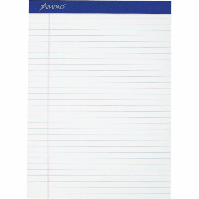 Pad features 50 letter-size sheets of white writing paper and sturdy, 40 point, chipboard back. Dark Blue header strip is attached with strong staples. Perforated pages in pad allow neat, no-tear sheet removal. Each legal/wide-ruled sheet has 11/32" line spacings and a 1-1/4" left margin.