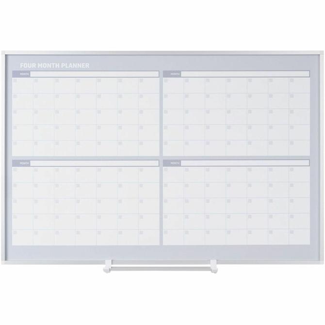 Four-month planner offers the perfect planning and presentation solution, suiting all office needs. Magnetic Gold Ultra dry-erase surface is scratch-resistant and ghost-resistant. Calendar is ideal for managing teams and schedules with four months on one board. Modern, sturdy aluminum frame allows the board to fit any environment, and a sliding pen tray keeps all accessories close at hand. Dry-erase planner includes a wall-fastening kit.