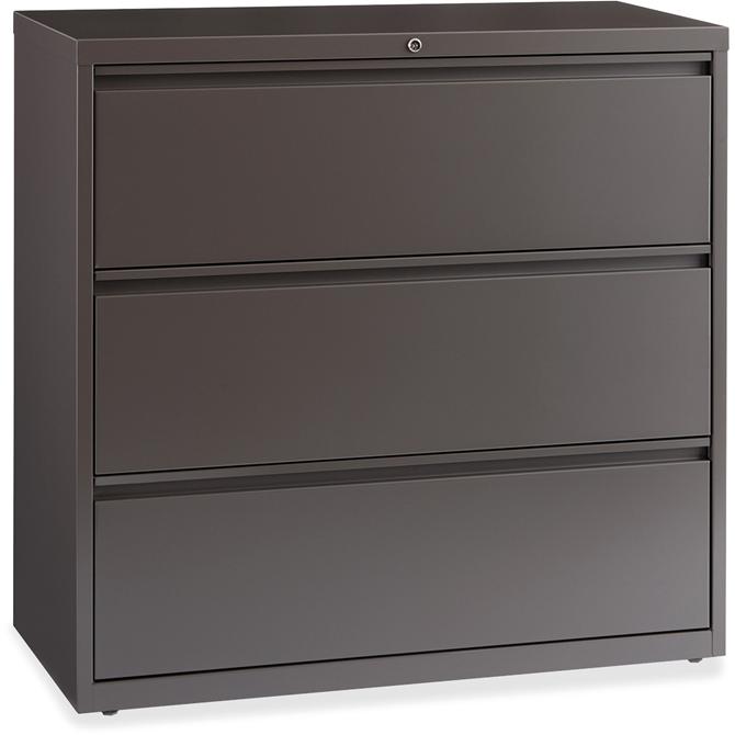 42" wide lateral file features three versatile drawers with hanging file rails for side-to-side filing of letter-size, legal-size or A4-size. Each drawer has a magnetic label holder for easy identification where you need it. Design also features a core-removable lock for security; dual locking bars; full-width pull; ball-bearing slide suspension for smooth opening and closing; reinforced base; and four adjustable leveling guides for stabilization. Interlock system prohibits the extension of more than one drawer at a time for your safety. Counterweight prevents tipping. Lateral file meets or exceeds applicable ANSI/BIFMA standards.