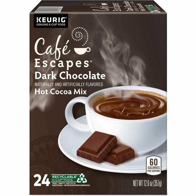 Every day, you should do something nice for yourself. Take a break. Relax. Recharge. Give in to a few delicious moments of "me time." Café Escapes salutes this notion with a delectable collection of indulgent treats. They're rich, satisfying and decadent - but not so much that you can't enjoy one every day. Whether you need an afternoon pick-me-up, or something to go with that hard-to-put-down book, Café Escapes is the perfect companion. Prepare a cup just for you and enjoy a moment of uplifting downtime. Café Escapes Dark Chocolate Hot Cocoa features a new and improved flavor. Dedicated chocolate devotees know the dark stuff is the ultimate in decadent indulgence. Rich and sophisticated, with just the right amount of sweetness - it's a moment of luxurious escape you can enjoy every day. Now made with real chocolate! Compatible with Keurig® K-Cup® pod single-serve coffee makers.