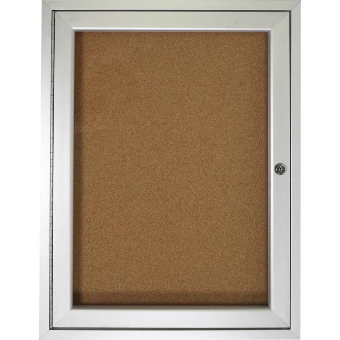 Enclosed cork bulletin board features a single door and anodized aluminum in a satin finish. The self-healing, natural cork surface will hold up under the most demanding use to provide years of reliable service. Door features full-length hinges and shatter-resistant acrylic panels with flush-mount lock and two keys for added security. For indoor use, bulletin board also features concealed corner brackets for easy, secure mounting.