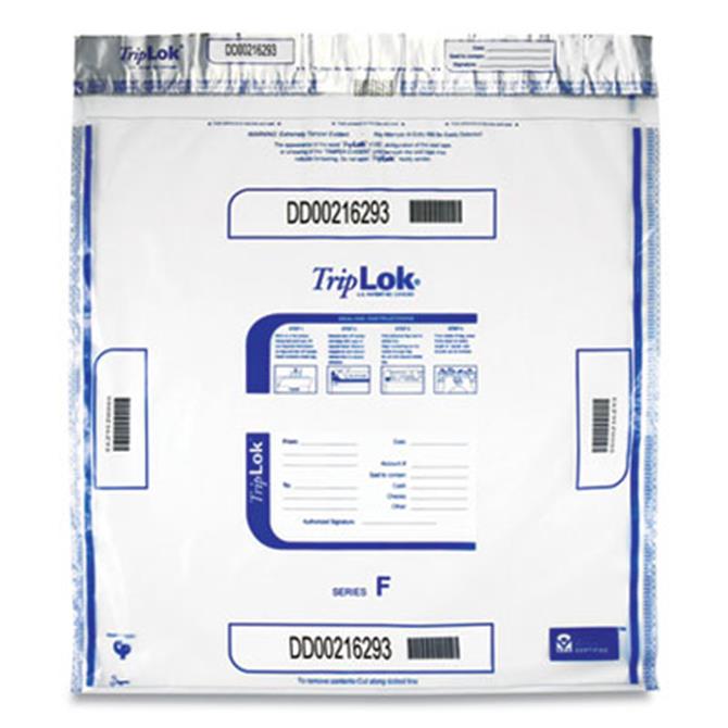 Patented triple-seal closure with interior adhesive leaves no openings once sealed, improving efficiency of your vault and cash transport operations. Security micro perforation immediately reveals attempts to pull closure up. Anti-static liner does not cling to hands and clothes, speeding up processing. Aqua detect ink reveals exposure to fluids. Large serial numbers and barcodes for easy tracking via CCTV. Security border and micro printing prevent cutting and resealing. Width: 20"; Depth: 20"; Color(s): Clear; Material(s): Plastic.