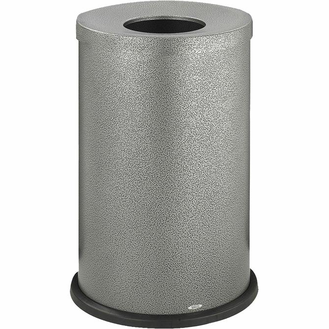 Distinctively designed open top receptacle is made with the highest quality, puncture-resistant, fire-safe steel for indoor use. 8-1/2" opening at top allows easy disposal of waste for high-traffic areas. Special durable black speckle powder-coat finish will not show fingerprints. Hoop ring design secures a 35 gallon bag inside and eliminates the need for a rigid liner. Design also features a rolled rim and double-lock seams for durable long life.