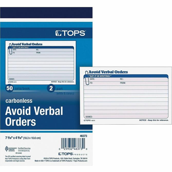 Avoid Verbal Orders Book contains forms that let you put in writing business agreements or orders that were arranged verbally. Two part forms include a white original that is perforated for easy removal and a carbonless canary copy that stays bound for your records and follow up. SFI Certified.