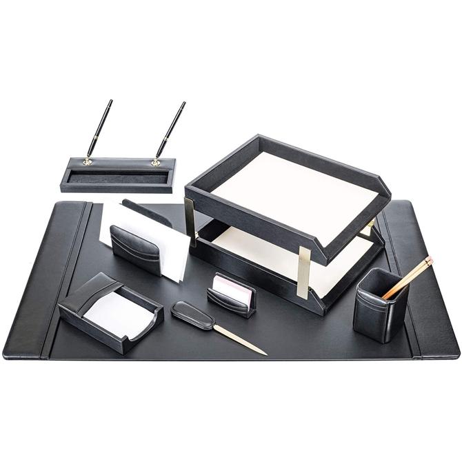 10-piece desk set features everything you need to keep your desktop stylish and organized. Each piece is made with top-grain leather that's incredibly strong and offers a luxurious look that's perfect for any professional environment. Plus, they have a smooth velveteen lining for excellent protection where you need it most. Desk set includes a 34" x 20" side-rail desk pad, two letter-size trays, pencil cup, 4" x 6" memo holder, letter holder, business card holder, letter opener, double pen stand, and stacking tray posts.
