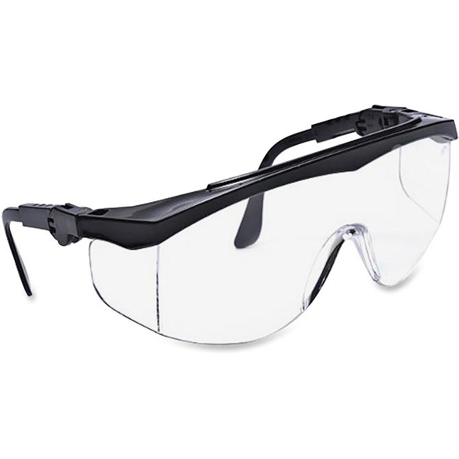 Tomahawk safety glasses provide comfort, protection and style. Ratchet-action temples are fully adjustable and have five positions. Other features include a stylish wraparound design and one-piece polycarbonate lens with integral sideshields. The lightweight, nylon frame provides added comfort and balance. Safety glasses filter out 99.9 percent of UV radiation.