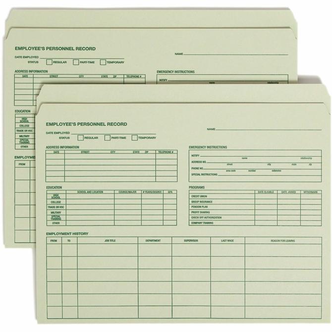 Employee record file folders are ideal for maintaining confidential employee information in a consistent format. For added security, the folder may be reversed so that all information written on the preprinted forms appears on the inside of the folder.