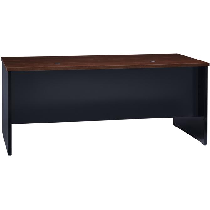 Left-pedestal desk is part of the Lorell Commercial Steel Desk Series with commercial-quality performance and components. Durable steel chassis supports a 1-1/8" thick, laminated top. Laminate is stain-resistant and scratch-resistant for durability. This 72" wide, left-pedestal desk with adjustable leveling glides can be used freestanding or paired with a right return to create an L-workstation. To create a U-workstation, simply combine it with a bridge and right credenza. Desk includes one box drawer for supplies and one file drawer for hanging file folders. Both lock. Steel ball-bearing suspension makes drawers easy to operate quietly. Built-in cord management with two grommets in the top and two more grommets on the end panels provides easy access to power and data while minimizing clutter. Rich walnut laminate and black paint create an upscale look and feel for any application. Superior steel construction withstands heavy activity and relocation.