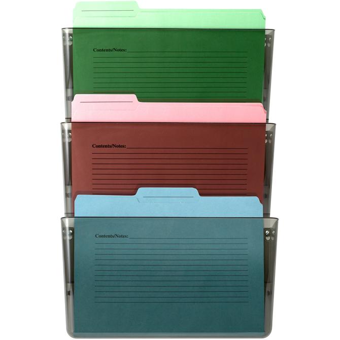 Space-saving, Mountable Wall File offers a unique design to conveniently add more files. Wall file holds letter-size documents and smaller items to keep your supplies organized. Easily mount to walls or partitions with included double-sided tape and mounting screws. Wall file is made of plastic for enhanced durability. Adjustable partition hanger is not included.