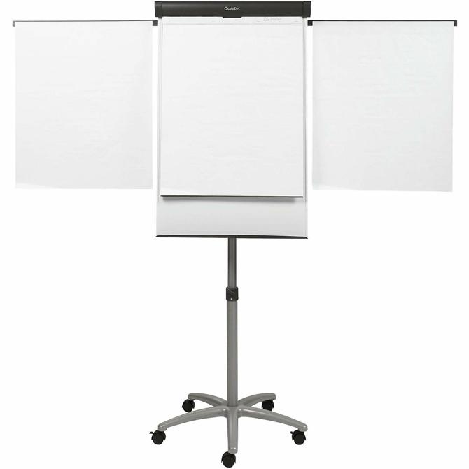 Mobile presentation easel features a magnetic surface for dual-purpose use as a writing board and magnetic bulletin board. Height-adjustable construction allows you to quickly change the height for better visibility to everyone in the room. Securely attach any size flip-chart pad to the easel with the included flip-up clamp and sliding pad hooks. Smooth-rolling wheels allow quick, easy mobility. Full-length accessory tray keeps your writing utensils always within reach.