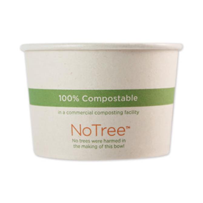 Made from rapidly renewable, unbleached sugarcane paper. No trees are used to make NoTree® bowls. Bio-lining made from plants to create a moisture barrier. Disposable, freezer safe, and contain no wax or plastic lining. For use with hot or cold food items. Suitable for liquids up to 220° F. Great for soup, salad, fruit, oatmeal, ice cream, snacks and more. 100% compostable in two to four months in a commercial composting facility. Food Container Type: Base; Material(s): Unbleached Sugarcane Paper; Food Container Material Type: Sugarcane; Capacity (Volume): 16 oz.