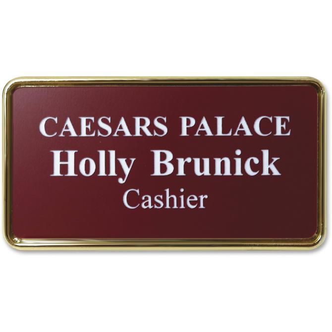 Framed name badge offers a clean, neat way to display your name. Gold-colored border frames your name for an elegant look. Badge measures 1-1/2" x 3". Customize with a maximum of two lines and your choice of more than 35 fonts and 20 varieties of sign colors. Badge is made of high-grade, durable plastic.