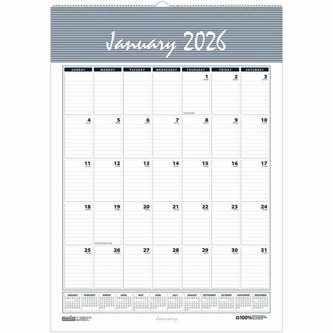 Wall calendar offers neat monthly planning for your office. Planning pages range 12 months from January to December and are printed in wedgwood blue and gray. One-page-per-month format includes ruled daily blocks (1-1/2" x 2-1/4"), count of days/days remaining, national and religious holidays, and full-year reference calendar. Wall calendar features a full chipboard backer and wire binding with an eyelet for easy hanging.