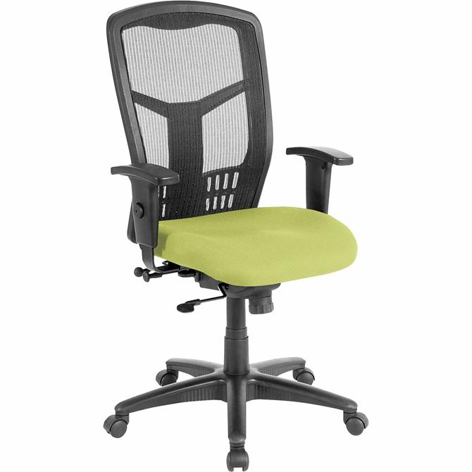Executive High-back Swivel Chair cradles you during a hard day at work. Ergonomic mesh back supports the natural curvature of your back for less strain during work at the computer or meetings at your desk. Synchronized control tilt reclines the back at a 2-to-1 ratio to the seat angle so you can find the perfect position and relax. Adjust the seat at the depth you need with the seat-glide mechanism. It allows the cushioned seat upholstered in antimicrobial vinyl to travel forward, back and lock into your preferred position. Arms with polyurethane padding adjust in height and width. Other functions include pneumatic seat-height adjustment from 18" to 21-1/2" , 360-degree swivel and tilt tension. Five-star nylon base is equipped with smooth-rolling casters for easily moving the chair where needed. Weight capacity is 275 lb. High-back chair meets the CA117 fire-retardant standard.