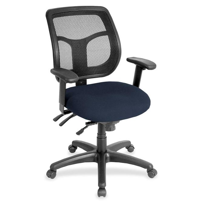 Apollo Multifunction Task Chair features a ratchet back that moves up or down relative to the seat for lumbar support and comfort. Mesh back provides enhances airflow for breathability. Set back at an angle for personalized comfort in reclined position. Seat-height adjustment lets you position the seat height relative to the floor. Chair rocks back and forth with adjustable, center-tilt mechanism. Fabric-upholstered, padded waterfall seat with sloping front reduces pressure on the back of the knees. Tilt-tension control with tilt lock allows you to adjust the recline rate based on your weight. Seat tilts forward to change the angle for a comfortable position when you're using a keyboard. Arm-height adjustment adjusts arm up or down while arm pads angle in or out. Nylon, five-star base features casters for easy mobility. Chair is Greenguard certified to have low chemical emissions.