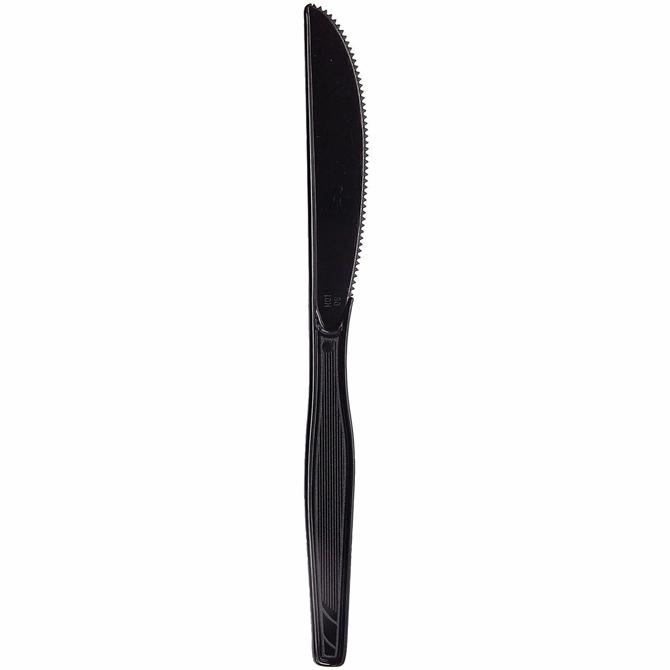Plastic knives with an elegant black color are ideal for office parties, luncheons and breakroom use. Use with cold or hot foods. Utensils are made of medium-weight polystyrene for rigidity and flexibility as well as shatter-resistant and durable. Each knife measures 7". Efficient Dixie dense pack packaging helps conserve valuable storage space.