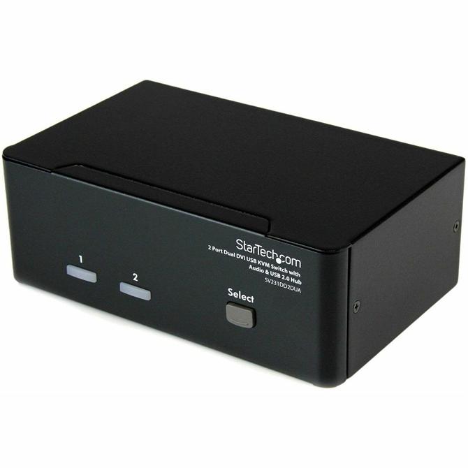 The SV231DD2DUA 2-port Dual DVI USB KVM Switch allows two PCs, each with dual DVI video outputs, to share two monitors, one microphone and set of speakers, one keyboard and one mouse as well as two other USB peripherals. An ideal solution for graphic designers, CAD/CAM designers or educational and financial institutions, the dual view KVM Switch allows you to instantly switch back and forth between dual DVI display PCs at the touch of a button, while maintaining professional level video quality on both monitors. The dual DVI switch also features an integrated USB hub port that allows USB 2.0 peripherals such as thumb drives, external hard drives or web cams to be shared between attached systems - eliminating duplicate peripheral costs. Please Note: This KVM switch supports DVI-D (digital) signaling only and it is recommended wherever possible to use DVI-D cabling across all PC to KVM and KVM to Console connections to ensure proper function. Please contact technical support if you require assistance identifying the proper cables. This product is TAA compliant and backed by a Startech.com 3 year warranty with free lifetime technical support. More from the Manufacturer