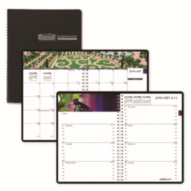 Each weekly and monthly spread has a beautiful garden scene to view, as you enter your appointments. Finding a specific date is easy thanks to colorful, printed monthly indicators. Features full Saturday and Sunday appointment spaces, Julian dates with dates remaining and a black suede-like cover to withstand ongoing use throughout the year. Made entirely of recycled materials. Dated: Yes; Academic Year: No; Calendar Format: Weekly/Monthly; Calendar Spread Format: One Week per Two-Page Spread; One Month per Two-Page Spread.