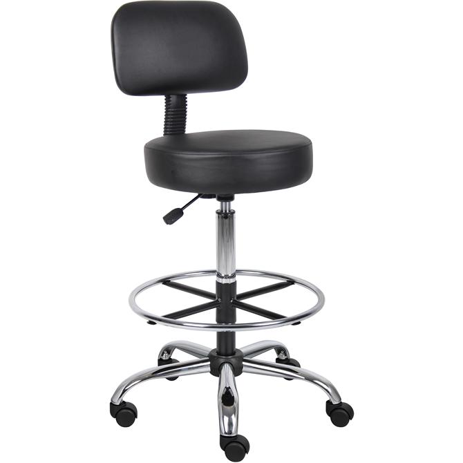Medical stool is upholstered in antimicrobial Caressoft vinyl to give you the look and feel of leather while allowing it to be easily cleaned with a damp cloth. Durable upholstery covers a 4" thick, molded foam seat to provide extra comfort and padding. Plush back cushion provides comfortable back support throughout extended periods of work. Easy-to-reach, gas lift lever offers a vertical range of 6" and makes it easy to modify your height for increased comfort and ergonomic benefit. 20" chrome footing provides added foot and leg support. Hooded, double-wheel casters slide smoothly on floors to make it easy to move and shift directions. Medical stool supports up to 275 lb.