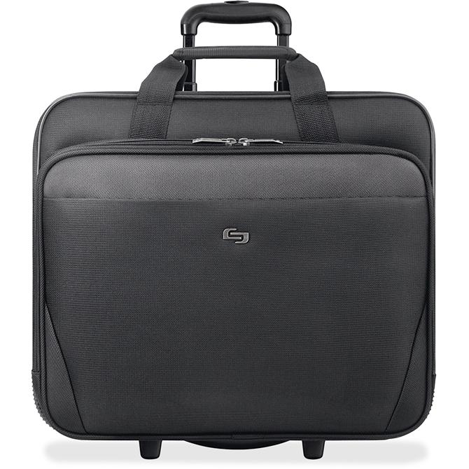 Protect laptops with up to a 17.3" display while you travel with this classic rolling case. Padded compartment makes sure your laptop is safe and secure. Dedicated interior pocket is perfect for storing your iPad, tablet or eReader. Front zippered pocket and front zip-down organizer section offer additional storage for chargers or personal items. Dual file section provides an easy way to keep your documents organized. Traveling with this rolling case is smooth and easy. Use the carry handles or hidden telescoping handle system that easily retracts with just a push of a button. This case is designed with a polyester body for lasting durability while you're on-the-go.