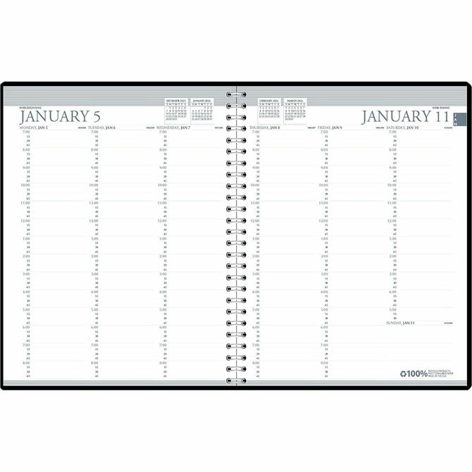 Professional weekly planner features an embossed, simulated leather cover for a professional look and vertical planning that ranges 12 months from January to December. Strong wire binding firmly keeps the planner intact throughout the year. Printed monthly indicators help you quickly find the date you need, Two-page-per-week spreads include ruled daily columns, half-hourly appointment times from 7 AM to 8:45 PM on weekdays and 7 AM to 5:30 PM on Saturday, Monday-through-Sunday scheduling, count of days/days remaining, a ruled notes section and past, current and two future months reference. Nonrefillable planner also features a three-year calendar reference page for long-range planning and additional page with important holiday dates for three years in list form. Paper is made with a high percentage of recycled material.