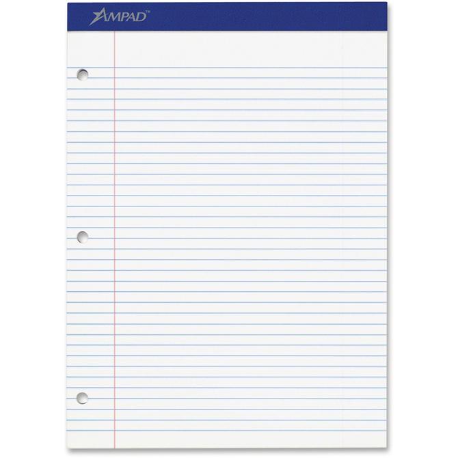 Perforated writing pad features 100 letter-size sheets of quality, 15 lb. white paper. Each sheet is three-hole punched for binder storage and college-ruled with 9/32" line spacings and a 1-1/4" left margin. Perforations allow a clean-edge tear-out. Super stiff, 80 point, chipboard back provides writing support for handheld use.