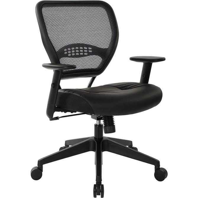 Managers chair offers a breathable back and thickly padded, Eco Leather seat. Dark Air Grid Back is equipped with built-in lumbar support. To further your comfort, angled arms feature soft polyurethane pads and adjust in height. Chair also features pneumatic seat-height adjustment from 18-3/4" to 23". The heavy-duty, angled nylon base is equipped with oversized, dual-wheel carpet casters. Seat measures 20-1/2" wide x 19-1/2" deep x 3-1/2" thick. Back size is 20-1/2" wide x 18-1/2" high.
