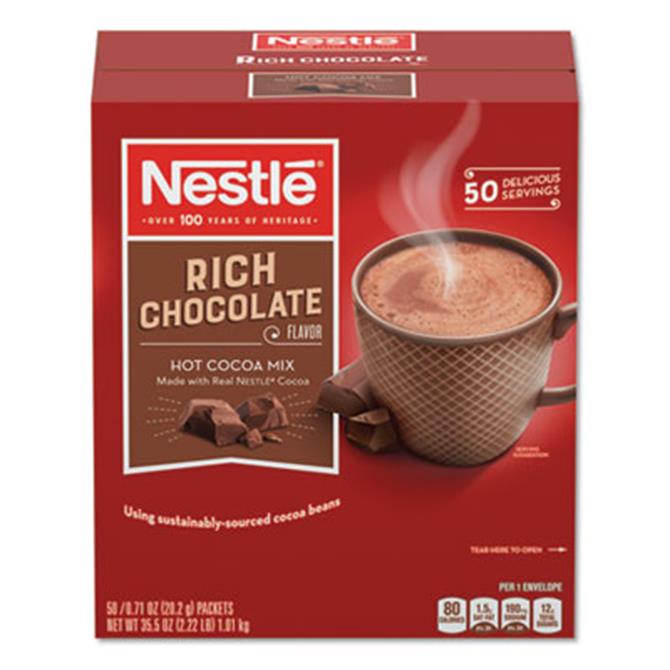 Rich hot chocolate mix to stay warm on those cold days. Contains 35% less sugar than other major brands. Enjoy the sweet flavor of Nestle Hot Cocoa. Each packet makes one perfect cup of cocoa. Beverage Type: Hot Cocoa; Flavor: Rich Chocolate; Packing Type: Packet; Capacity (Weight): 0.71 oz.