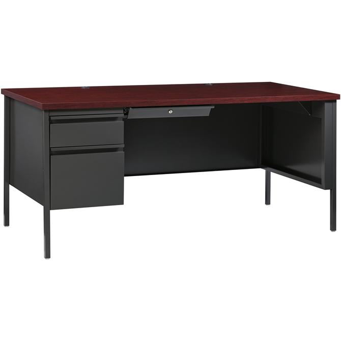 66" wide single-pedestal desk is part of the Lorell Fortress Series, a practical and professional desk solution ideal for business, government and educational offices. Use this left-pedestal desk with a Fortress right return for L-shaped configurations. Both have 3/4-height modesty panels for seamless lines. Durable, high-performance steel construction stands up to rigorous daily use. The 1-1/8" thick top with square edges features a Mahogany laminate surface that is scratch-resistant, stain-resistant and water-resistant. Desk design also features a box/file pedestal on the left. Both drawers lock and offer full-extension, ball-bearing slides and full-width, integrated drawer pulls. File drawer accommodates letter-size files. Central-locking center drawer features a core-removable lock. Two grommets allow easy cord management. Reinforced, double-frame inner structure keeps desk solid and sturdy for years of use. Steel desk in a charcoal color meets or exceeds ANSI/BIFMA standards.