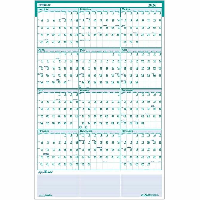 Laminated wall calendar offers an Express Track notes column, 12 months of planning and numbered weeks on both sides. One side has a vertical format, and the other side has a horizontal format. Both sides have a write-on/wipe-off surface, daily blocks (1-1/8" x 1-3/8"), count of days/days remaining, and notes space. Dated planning ranges 12 months from January to December. Wall calendar includes self-adhesive hangers and a water-soluble marker. FSC certified paper is made with a high percentage of recycled material and printed with soy ink.
