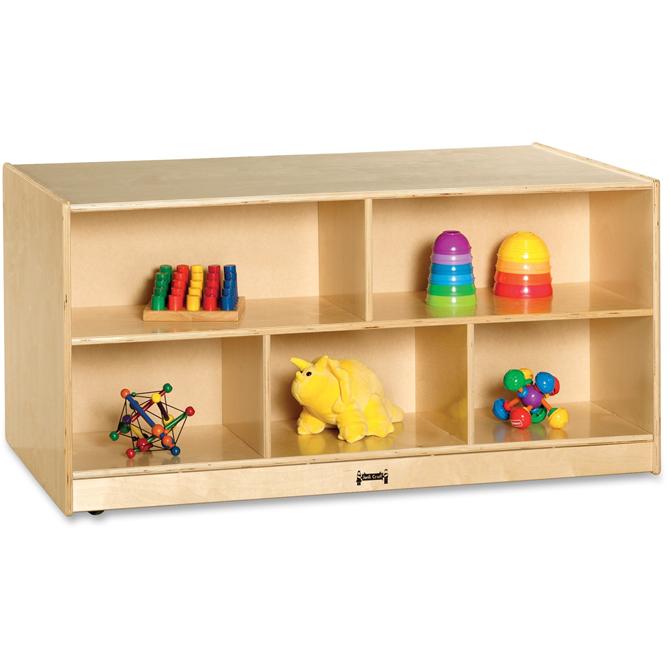 Maximize storage and organize any space with this double-sided storage shelf. Identical front and back provide easy access to toys, books and more. MAXBrackets allow the art center to be moved effortlessly from room to room without causing stress on the wheels and brackets. Wheels are made of hard rubber and won't leave black marks on your floor. Kickplate prevents children from losing small items underneath. KYDZSafe rounded edges allow children to play safely without getting hurt by sharp edges or corners. Dowel-pin construction prevents weakening at the joints. Ultraviolet acrylic coating is durable and resists yellowing over time.