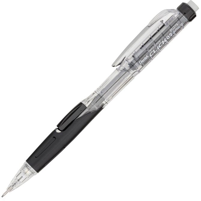 Mechanical pencil features a tinted barrel to let you monitor lead supply at a glance. Extra-long, nonabrasive, twist-up E10 eraser comes in handy when making corrections. Smooth, latex-free Comfort-Zone grip provides extended writing comfort. Stylish, metal pocket clip is convenient when going about your day-to-day routine. Convenient side button allows the 0.9mm lead to advance effortlessly without changing hand position. HB lead inside is equivalent to a No. 2 wooden pencil and scans on standardized tests. Twist Erase Click Mechanical Pencil is refillable with Pentel Super Hi-Polymer Lead and E10 jumbo refill eraser.