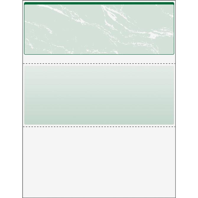 DocuGard Security Business Checks with a marbled pattern incorporate 11 security features recommended by the National Check Fraud Center and Check Payment System Association. They are compatible with most money-management software programs. Front security features Check-21 compliancy, hidden message ("VOID" appears when copied), an erasure-resistant background and a security warning that calls attention to the security features listing on the reverse side. Back security offers a security features listing, hidden message, microtext printing, anti-splice backer, verification number and watermark that is printed in coin-reactive ink. Top section features a marble green line for a distinct look. Perforations are 3-1/2" and 7" from the top. Checks are for use with all laser and inkjet printers.