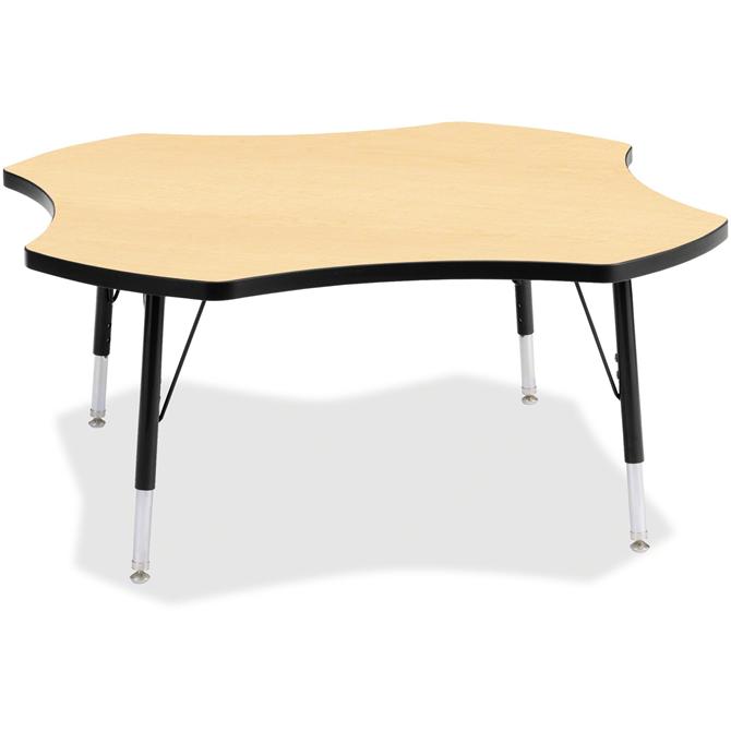 This four-leaf activity table provides the perfect seating arrangement for up to four adults. Durable laminate features an easy-to-clean surface. TRUEdge is permanently thermo-fused to the edges to prevent chipping. Extra-safe, dual-screw steel legs allow you to easily adjust the height of the table. Powder-coated, adjustable legs can be repositioned in 1" increments to provide maximum comfort. Leg guides reduce squeaks, prevent snags and eliminate rusting.