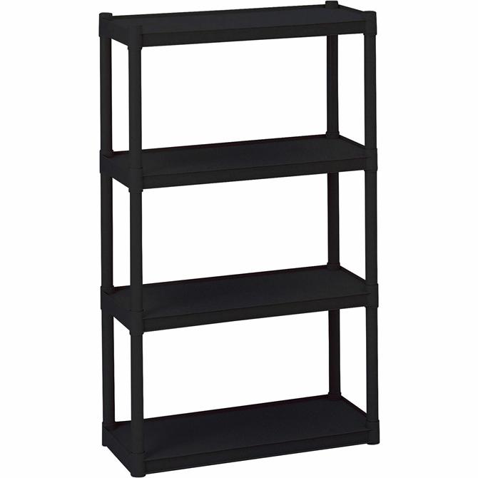Four-shelf Open Storage System offers sturdy storage space. Heavy-duty upright offers increased stability and holds 75 lb. per shelf when evenly distributed. Constructed of injection-molded polypropylene, storage system won't scratch or dent. Easily snap it together.