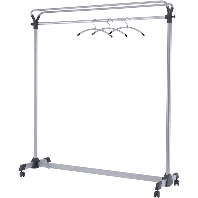 Sturdy double-sided garment rack holds 50 coat hangers (sold separately) on its 55-3/8" long hanging bar. Open design allows hanging from either side. Upper shelf is designed for luggage and hand purses. Plastic hooks on either end allow hanging of accessories. Rack has a silver powder-coat finish and four roller casters (with two that lock) for easy mobility.