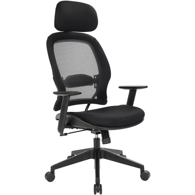 Executive high-back chair features active lumbar support and a mesh screen back. Mesh screen back provides increased breathability while adjustable, padded lumbar support maintains the natural curve of your spine. Functions include one-touch pneumatic seat-height adjustment, 360-degree swivel, tilt, tilt tension, tilt lock and synchronized knee tilt (2-to-1 synchro tilt). Headrest adjusts in height and depth. Arms have soft pads and adjust in height. Seat size is 21-7/8" wide x 19-1/8" deep x 18-4/5 to 23" high. Back size is 20-5/8" wide x 29-3/4" high. Distance between arms is 19". High-back chair features a thickly padded contoured mesh seat, heavy-duty metal base, and oversized, dual-wheel carpet casters.