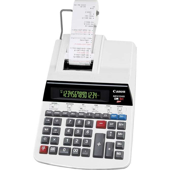 Heavy-duty printing calculator features a 14-digit, two-color illuminated display. Print 4.3 lines per second with the high-speed, two-color ink ribbon. Positive numbers are printed in black, and negative numbers are printed in red. Functions include Change, currency conversion, tax calculation tip, cost/sell/margin, double/triple zero keys, up/off/down rounding, item count, memory and grand total. Decimals are at 0, 2, 3, 4, 6, add mode and F (floating). Calculator runs on AC power.