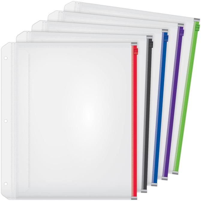 Zippered pocket expands up to 1/2" (1.27cm) to hold up to 100 sheets of letter-size paper, notes or other accessory items. Poly material will not stick to contents. Pocket is three-hole punched for use in standard three-ring binders. Assorted colors include blue, black, red, purple and green.