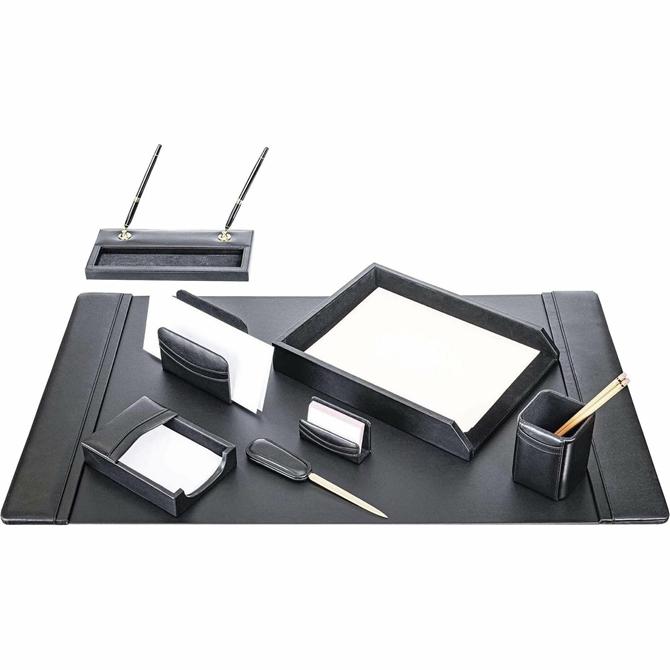 Eight-Piece Desk Set features an assortment of durable supplies to help you work efficiently throughout the day. Top-grain leather adds professional style to any work space. Soft velveteen protects surfaces from scuffs and scratches. Desk set includes a desk pad, letter-size tray, pencil cup, memo holder, letter holder, business card holder, letter opener and double pen stand.