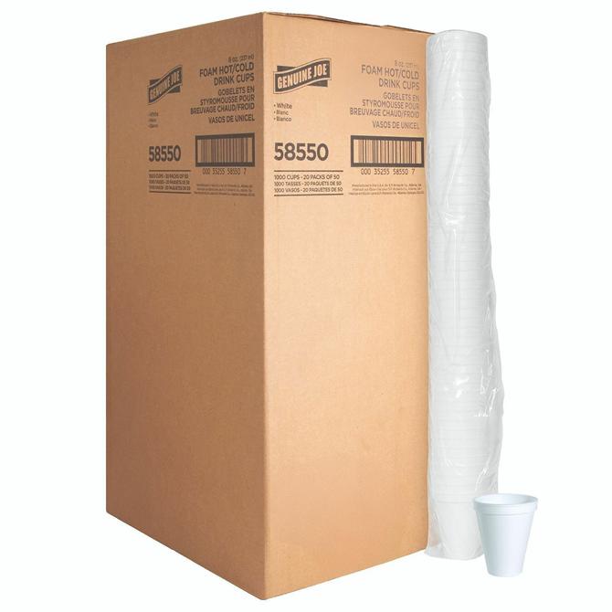 Versatile foam cups feature a strong, one-piece construction that maintains beverages at their optimal temperature longer. That means these cups keep hot drinks hot and cold drinks cold. This durable material keeps hands comfortable on the outside so these cups don't require sleeves and double-cupping to drink your favorite beverage. That means you won't have to keep sleeves available in your beverage center and can keep your cups stocked better. Space-saving Styrofoam also holds carbonation better than paper alternatives. Rinse and use the sturdy cups for your second and third cups of coffee or tea. Cups are disposable so you can enjoy easy cleanup. Lightweight nature allows easy transport and easy stocking of your beverage center or reception area.