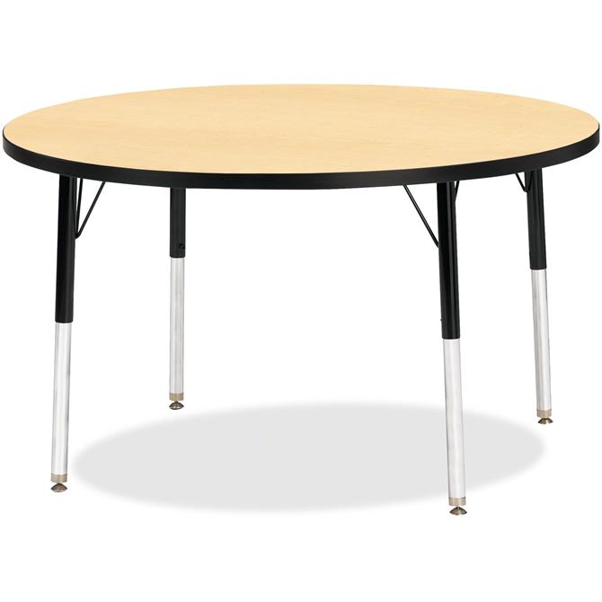 Let children safely work on their favorite arts and crafts on this round activity table. Laminate is durable and features an easy-to-clean surface. TRUEdge is permanently thermo-fused to the edges to prevent them from chipping. Extra-safe, dual-screw steel legs allow you to easily adjust the height of the table. Powder-coated, adjustable legs can be repositioned in 1" increments to provide maximum comfort for children. Leg guides reduce squeaks, prevent snags and eliminate rusting.
